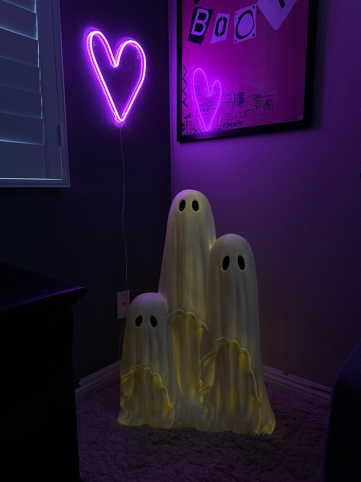 Viral TikTok Halloween cheesecloth ghost trio light up decor. Measures approx 32 in tall 21 in wide 12 in length. Make of a hard plastic material. Lights up with 3 AA batteries (batteries not included).
